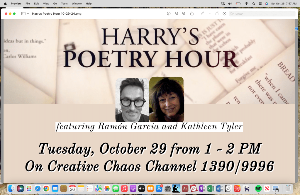 Please join us to see/hear the splendid poets Florence Weinberger & Kathleen Tyler, read their poetry on Harry’s Poetry Hour, Creative Chaos MPTF, on Tuesday, March 14, 2023, 1-2 PM PST. Thanks to Jennifer Clymer, Director, MPTF Studios, & the Creative Chaos Team. Here’s the Zoom link for Tuesday. Please check in 5 minutes before 1 PM.